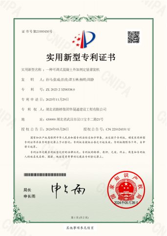 5月28日,由湖北路橋華晟通公司自主研發的新型實用專利《一種可調式混凝土外加劑定量灌裝機》順利通過國家知識產權局嚴格審查,獲得專利證書。在特種混凝土領域,湖北路橋華晟通公司獲得多個專利、軟著、標準圖集、科技項目、實體工程及標準等相關知識產權,牢固占據特種混凝土新賽道,進一步增強了公司科研創新驅動生產發展的強大動力。