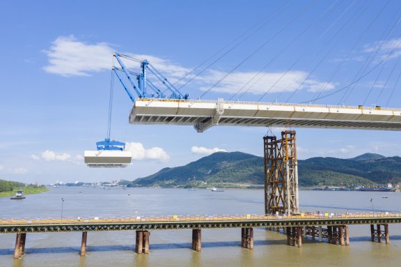 依托武穴長(zhǎng)江公路大橋項(xiàng)目,針對(duì)鋼箱梁架梁過墩的問題,采用分節(jié)段承插式臨時(shí)墩施工技術(shù),提前施工第一節(jié)段的臨時(shí)墩,待臨時(shí)墩墩頂?shù)牧憾渭茉O(shè)完成后,再利用鋼箱梁梁面布置的液壓千斤頂和鋼絞線提升第二節(jié)段到設(shè)計(jì)標(biāo)高,為主梁架設(shè)過墩預(yù)留操作空間。結(jié)合施工工藝、監(jiān)控量測(cè)和成橋受力情況,在雙懸臂施工狀態(tài)下,創(chuàng)新性地在臨時(shí)墩與鋼箱梁之間采用軟連接設(shè)計(jì)。軟連接采用柔性吊帶穿過耳板連接,能夠快速地鎖定及解除,避免對(duì)結(jié)構(gòu)產(chǎn)生擾動(dòng),現(xiàn)場(chǎng)可操作性強(qiáng)。在主梁架設(shè)懸臂施工全周期方面具有良好的穩(wěn)定性、安全性和抗風(fēng)性,對(duì)于斜拉橋主梁懸臂施工條件下的臨時(shí)墩設(shè)置有一定的借鑒作用,具有較好的應(yīng)用效果及推廣應(yīng)用前景。